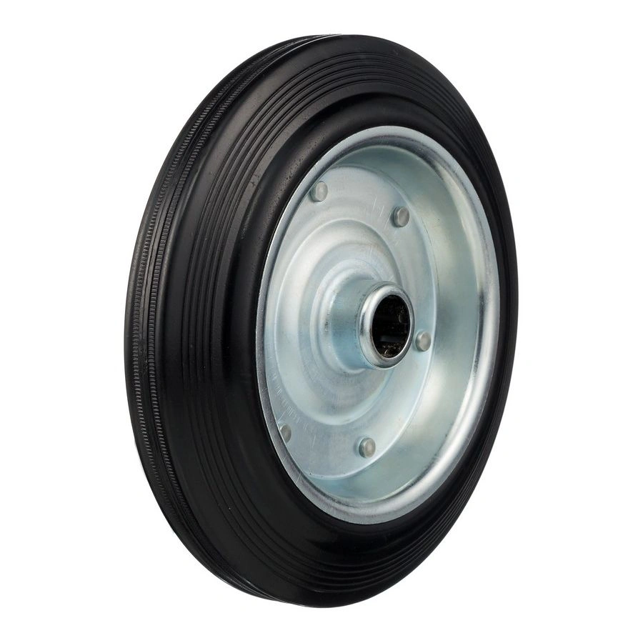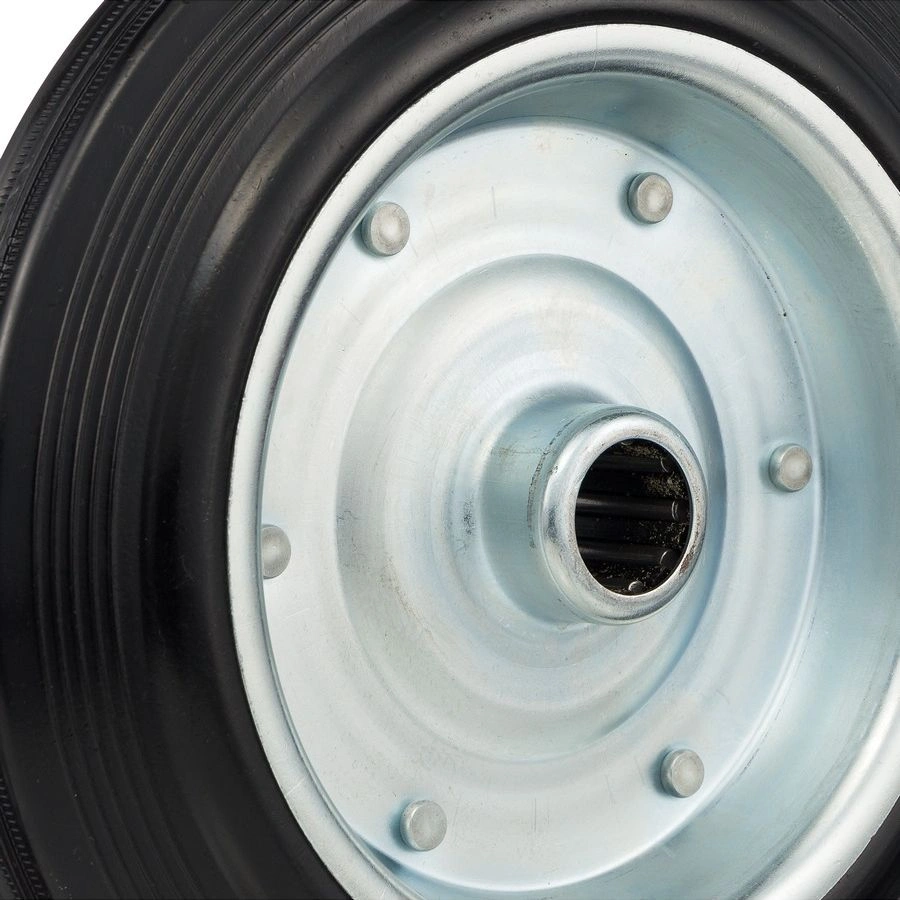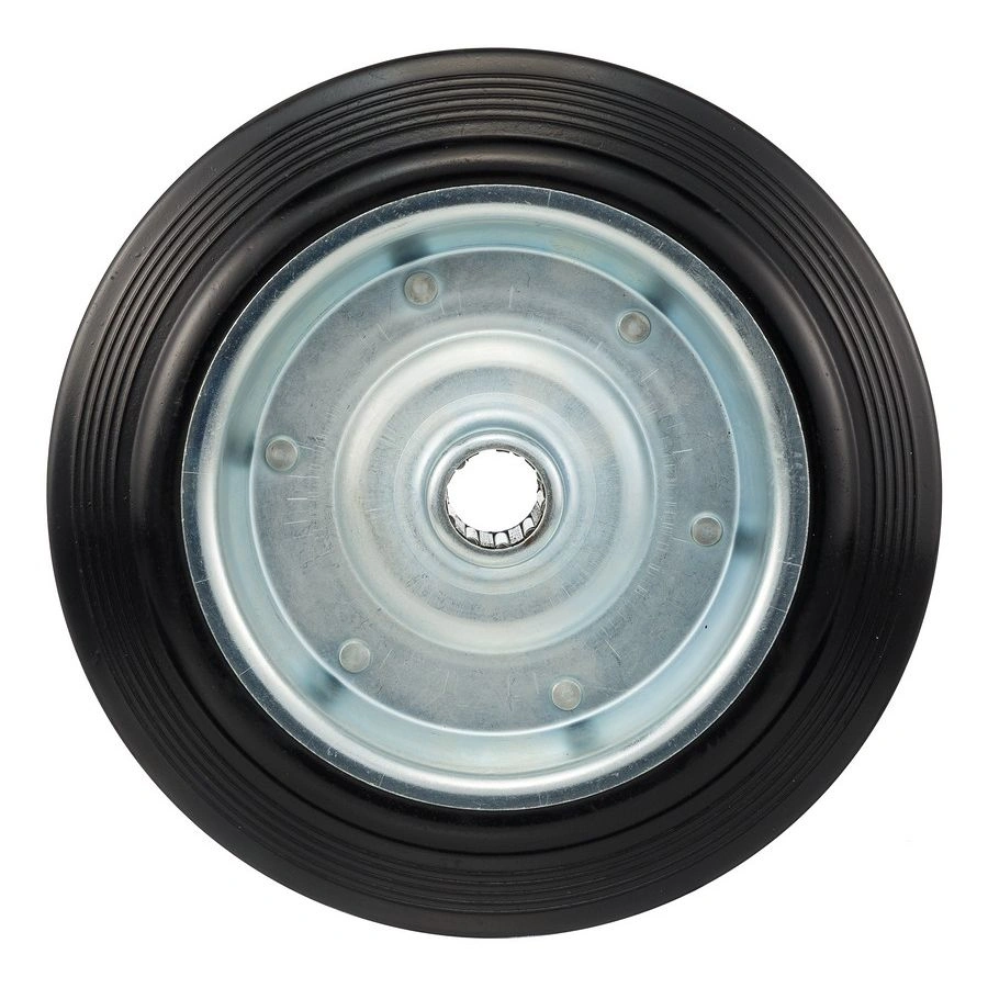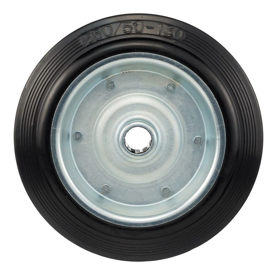 Колесо под ось 20 мм. 4000-250, диаметр 250мм., грузоподъемность 210кг., резина, металл. Колесо из черной литой резины. Центр из стального оцинкованного обода из штампованной стали. В оси колес роликовый подшипник. Колеса из черной резины, центр из двух гальванизированных дисков из штампованной стали. Роликовый (игольчатый) подшипник расположен в углублении, выдавленном под прессом, и содержит цилиндрические ролики подшипника. Возможно применение на относительно грубых полах складов, заводов, производственных и строительных площадках. Данные колеса можно использовать на неровных поверхностях, во влажной окружающей среде и использовании вне помещения, не рекомендуется применять в среде с органическими растворителями, хлорированными веществами, гидрокарбонатами и минеральными маслами. Температура эксплуатации от -20 до +70С.