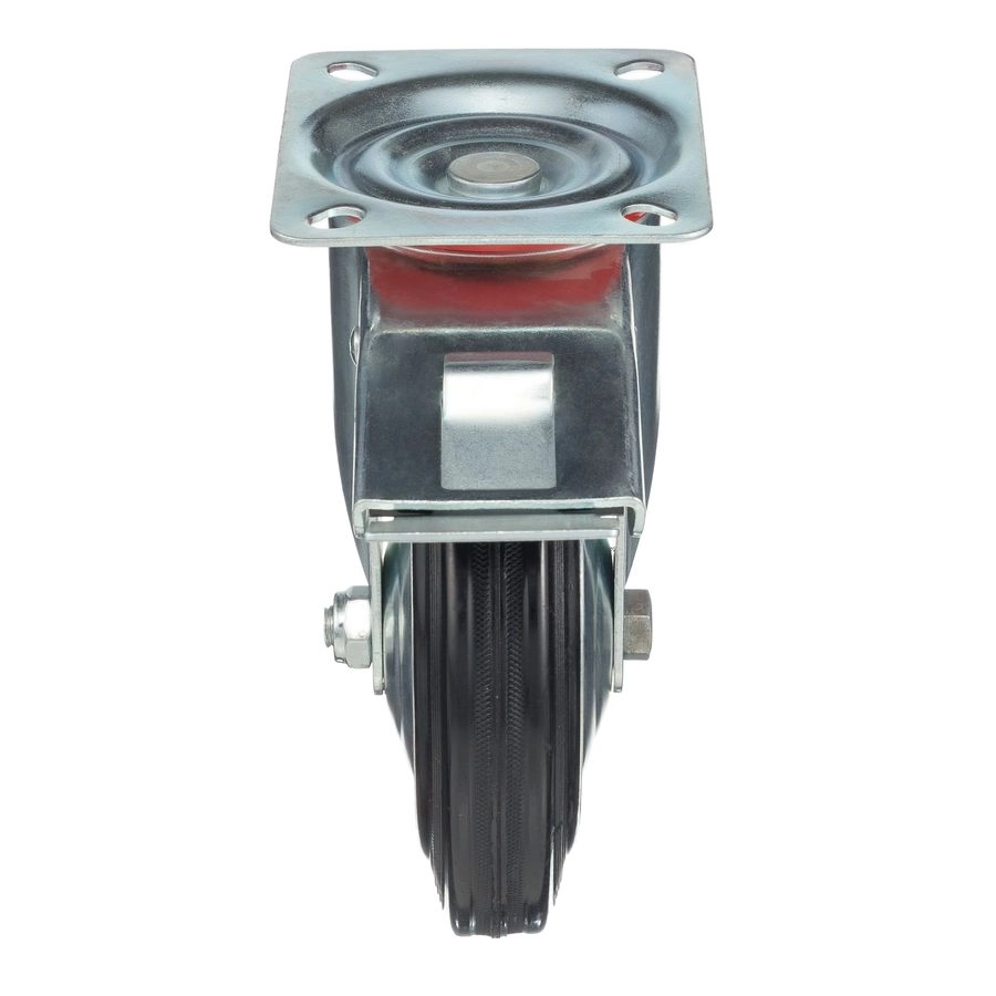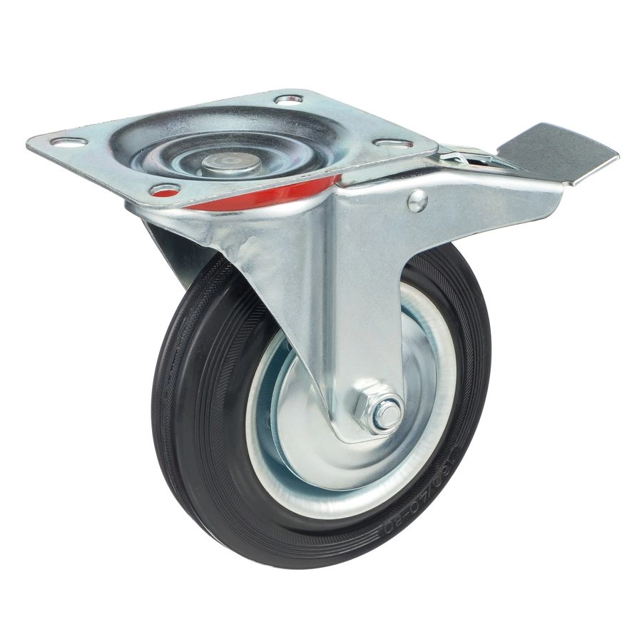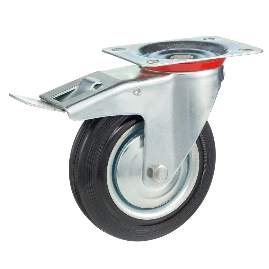 Колесо поворотное с тормозом 4003-160, диаметр 160мм., грузоподъемность 145кг. Колеса из черной литой резины, центр из двух гальванизированных дисков из штампованной стали. Роликовый (игольчатый) подшипник расположен в углублении, выдавленном под прессом, и содержит цилиндрические ролики подшипника. Кронштейн изготовлен прессованием из листовой стали. В поворотном узле двухрядный шарикоподшипник. Кронштейн оснащен тормозом, блокирующим вращение колеса и вилки, относительно площадки крепления. Возможно применение на относительно грубых полах складов, заводов, производственных и строительных площадках. Данные колеса можно использовать на неровных поверхностях, во влажной окружающей среде и использовании вне помещения, не рекомендуется применять в среде с органическими растворителями, хлорированными веществами, гидрокарбонатами и минеральными маслами. Температура эксплуатации от -20 до +70С.