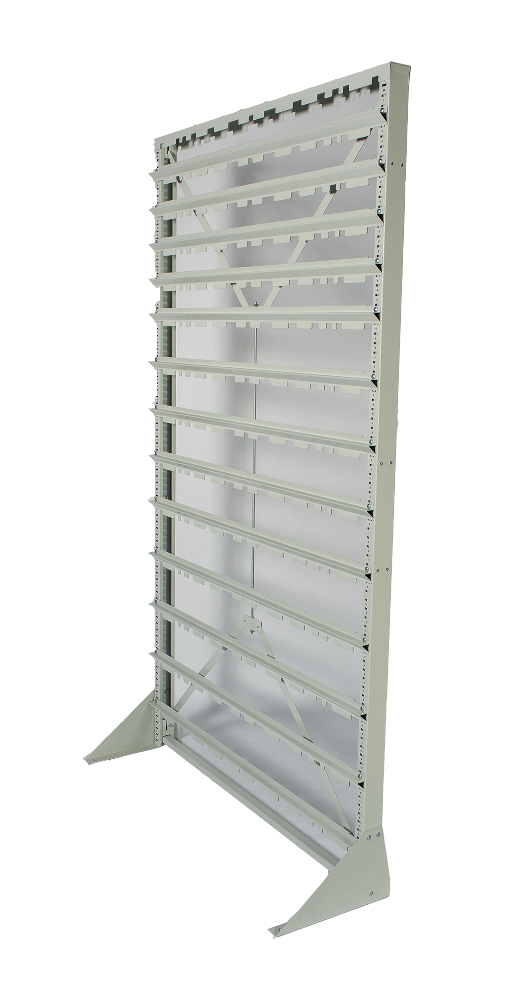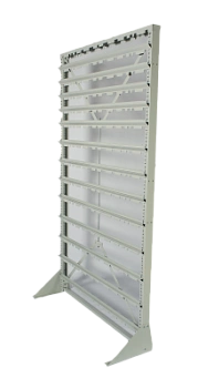 Стойка Стелла-техник V-1150х2020мм. без опоры, серия К, для пластиковых ящиков, состоит из металлической рамы, снабженной крестовиной-растяжкой для жесткости конструкции. На вертикальных стойках рамы имеются перфорационные отверстия для закрепления поперечных держателей. Держатели крепятся к раме с помощью саморезов. Высоту держателей можно изменять в зависимости от высоты закрепляемых пластиковых ящиков. В случае необходимости, стойка может закрепляться на передвижной платформе, специально предназначенной для этой цели. В комплект поставки входят: Вертикальная стойка перфорированная 2 шт.; Верхняя планка-опора 1 шт.; Полукрестовина для стяжки стойки 2 шт.; Шпилька резьбовая диаметр 8мм. для стяжки полукрестовин 1 шт.; Гайка М8 для шпильки резьбовой 2 шт.; Шайба М8 для шпильки резьбовой 2 шт.; Саморезы диаметр 6мм., на 1 держатель 2 шт.