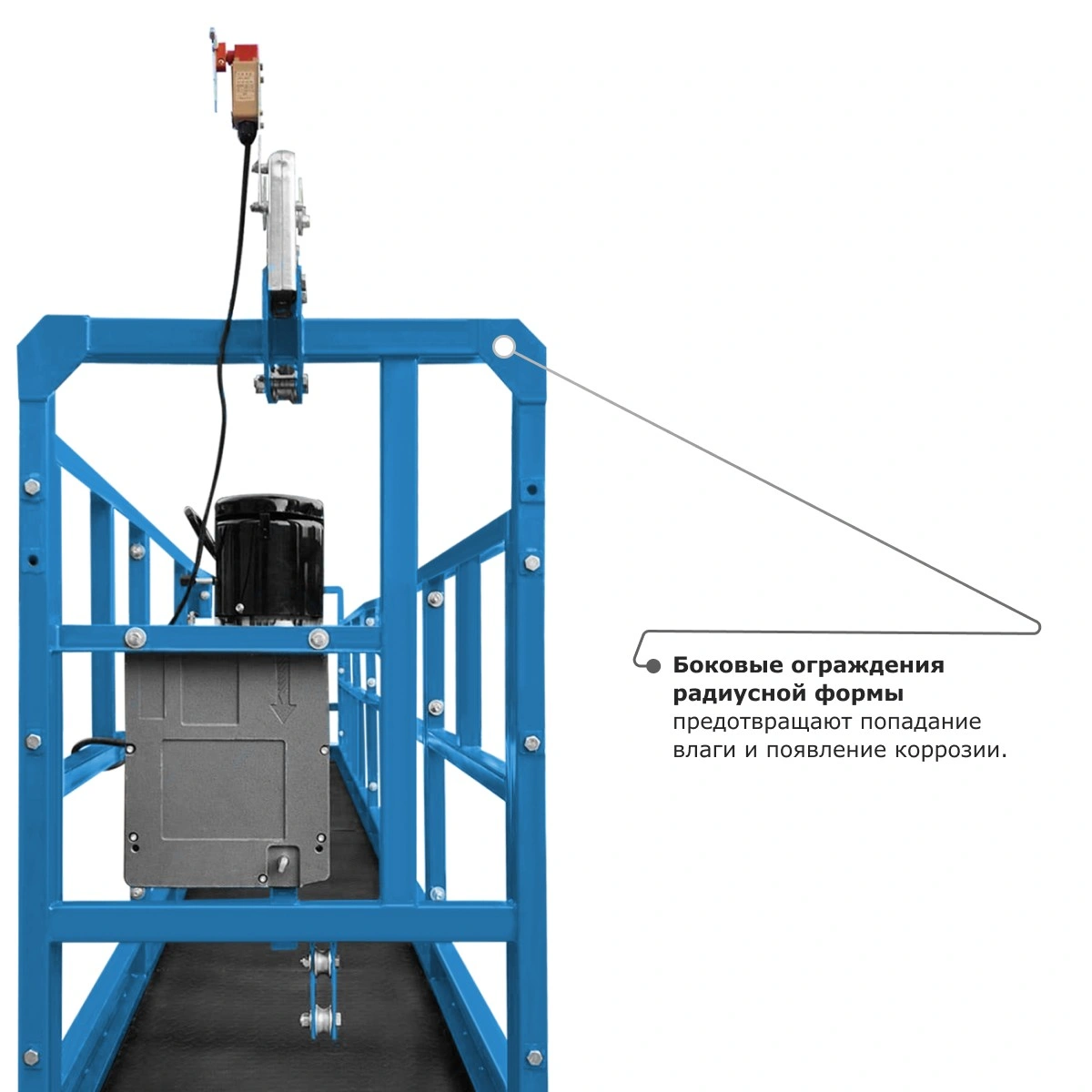 - Металлический отвод троса обеспечивает надежную защиту корпуса люльки и самого троса от протирания и повреждений.