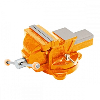 Массивный чугунный корпус и основание покрыты краской, защищающей тиски от коррозии, что увеличивает их рабочий ресурс. Сменные зажимные губки выполнены из закалённой стали высокого качества. Корпус, с возможностью поворота на 360° относительно основания, способствует удобной обработке заготовки. Наличие наковальни расширяет функциональные возможности слесарных тисков. Предусмотрено крепление основания к верстаку (рабочему столу) 3-я болтами.